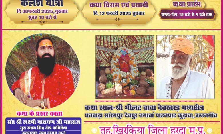 खिरकिया। प्राचीन श्री भीलटबाबा देवस्थान खरड़ मध्यक्षेत्र धनवाड़ा सारंगपूर में श्रीमद शिव महापुराण कथा का आयोजन 6 फरवरी से किया जाएगा। स्थान प्रमुख गेंदालाल पडियार छीपाबड़ वालो ने बताया कि कथा के प्रारंभ अवसर पर 6 फरवरी को सुबह 10 बजे से कलश यात्रा निकाली जावेगी। कथा में प्रखर वक्त संत लक्ष्मीनारायण महाराज रहेंगे। कथा की पूर्णाहुति 12 फरवरी को होगी। प्रतिदिन दोप. 12 से 4 बजे तक कथा होगी। खिरकिया से 12 किमी एवं बारंगी मुख्य मार्ग से 8 किमी देव खरड़ पहुंच मार्ग है। जहां से श्र्द्धालु पहुंचकर कथा का श्रवण लाभ ले सकते है।