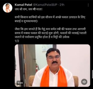 *पूर्व कृषि मंत्री कमल पटेल ने सभी किसानो से किया निवेदन* ..*.किसान खेत की नरवई नही जलाए*. *गौ वंश के लिए भूसा बनवाने और गौ शालाओं में भूसा दान के लिए किसान करे सहयोग*.. …….*पूर्व कृषि मंत्री कमल पटेल ने अपने x हैंडल पर वीडियो पोस्ट किया*…. *(देखे वीडियो)*