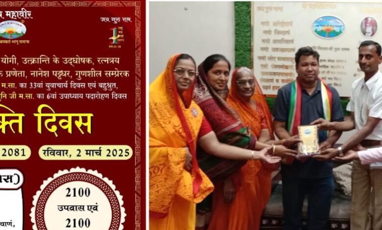 खिरकिया:- आचार्य भगवन 1008 श्री रामलाल जी महाराज साहब का 33 वां युवाचार्य दिवस एवं बहुश्रुत वाचनाचार्य उपाध्याय प्रवर श्री राजेश मुनि जी म.सा. का षष्ठम उपाध्याय पदारोहण दिवस जिसे श्रुतभक्ति दिवस के रूप में 2 सामायिक की आराधना के साथ 02 मार्च, 2025 रविवार को समता भवन खिरकिया में अखिल भारतवर्षीय साधुमार्गी जैन संघ के आव्हान पर पूरे देश में मनाया गया। इसी तारतम्यता में श्री श्वेतांबर जैन श्री संघ खिरकिया के तत्वाधान में सामूहिक समता शाखा सुबह 7:00 बजे से प्रारंभ कर जप-जाप, आरधना -साधना के साथ तप -त्याग के साथ जीवन को महकाते हुए 52 श्रद्धाशील गुरुभक्तो ने गुरु के प्रति अपनी दृढ़ श्रद्धा – समर्पणा का अतिसुंदर परिचय दिया।
