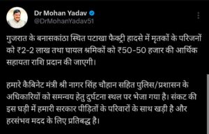 मुख्यमंत्री डॉ. मोहन यादव ने कहा है कि गुजरात के बनासकांठा स्थित पटाखा फैक्ट्री हादसे में मृतकों के परिजन को 2-2 लाख रूपए और घायल श्रमिकों को 50-50 हजार रूपए की आर्थिक सहायता राशि प्रदान की जाएगी।