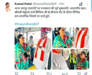 उल्लेखनीय है किसान नेता पूर्व कृषि मंत्री कमल पटेल वहा भाजपा के वरिष्ट नेताओ से भी भेंट की जयपुर एयरपोर्ट पर पूर्व कृषि मंत्री किसान नेता कमल पटेल ने राजस्थान की पूर्व मुख्यमंत्री वसुंधरा राजे सिंधिया से भेंट की है