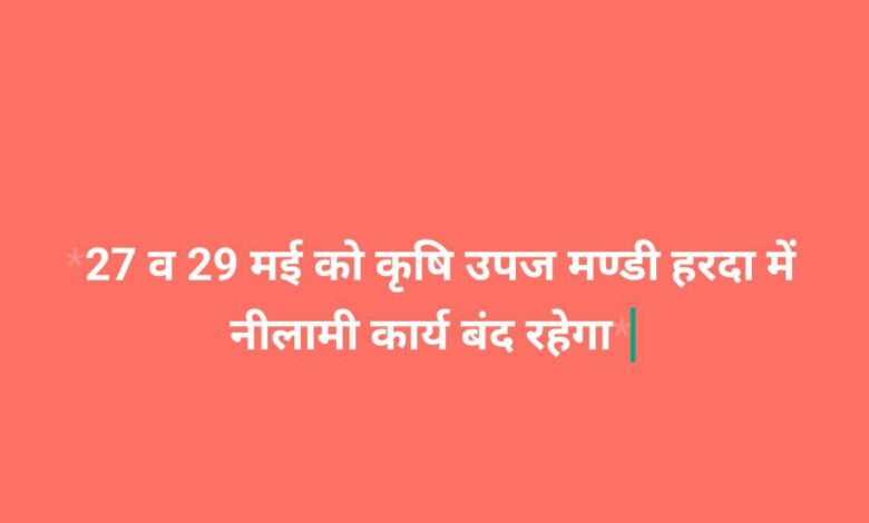 27 व 29 मई को कृषि उपज मण्डी हरदा में नीलामी कार्य बंद रहेगा*