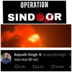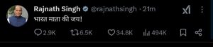 रक्षा मंत्री राजनाथ सिंह ने देर रात x पोस्ट शेयर की ओर भारत माता की जय लिखा पीएमओ सहित पूरा मंत्रालय सारी रात से जाग रहा है