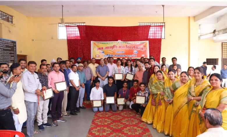 जन जागृति मंच खिरकिया के तत्वाधान में इस वर्ष की बोर्ड परीक्षाओं में नगर में अव्वल रहने वाले मेधावी छात्रों एवं नगर में सामाजिक कार्य करने वाली संस्थाओं का सम्मान श्री डी. एस. रघुवंशी (जिला शिक्षा अधिकारी ), श्री प्रवीण इवने (उपायुक्त पंचायत एवं ग्रामीण विकास विभाग ), श्रीमती प्रिन्सी जैन (नायब तहसीलदार ) एवं श्री आनंद अग्रवाल (सहायक परियोजना समन्वयक सर्व शिक्षा अभियान ) के विशिस्ट आतिथ्य में स्थानीय गुर्जर छात्रावास में आयोजित किया गया.. जिसमें मेधावी छात्रों एवं नगर की मुक्तिधाम समिति, अखिल भारतीय मारवाड़ी महिला सम्मलेन, समता महिला मंडल, छीपाबड़ विकास समिति एवं खिरकिया नव निर्माण समिति का उनके द्वारा समाज सेवा के छेत्र में किये जा रहे कार्यों हेतु सम्मान किया गया.. इस अवसर पर डी. इ. ओ. श्री रघुवंशी ने बच्चों को बधाई देते हुए कहा कि ये तो एक पड़ाव है अभी आपको और आगे कड़ी मेहनत इसी तरह करते हुए आगे बढ़ना है..
