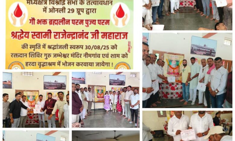 मध्यक्षेत्र विश्नोई सभा के तत्वावधान में *ओनली 29 ग्रूप* द्वारा *ब्रह्मलीन गौ भक्त परम पुज्य परम श्रद्धेय स्वामी राजेन्द्रानंद जी महाराज की स्मृति में श्रद्धांजली स्वरूप *रक्तदान शिविर* का आयोजन जम्भेश्वर मंदिर नीमगांव में किया गया जिसमें 129 यूनिट ब्लड डोनेशन किया गया एवं ग्रूप के सदस्यो द्वारा शाम को हरदा *वृद्धाश्रम* में भोजन करवाया गया ! इस उपलक्ष्य में समाज के वरिष्ठजनों का सहयोग मिला एवं युवाओं ने बढ़ चढ़कर रक्तदान किया । कोशिश पर्यावरण संस्थान के शांतिलाल जी बिश्नोई द्वारा सेवा की गई। रक्तदान में समाज युवाओं के साथ में राजपूत समाज से करणी सेना , ब्राह्मण समाज से परशुराम सेना के सदस्यों एवं गुर्जर समाज से भी रक्तदान किया । ओन्ली 29 ग्रुप केरक्तदान शिविर में एसडीएम साहब हरदा भी उपस्थित रहे ।