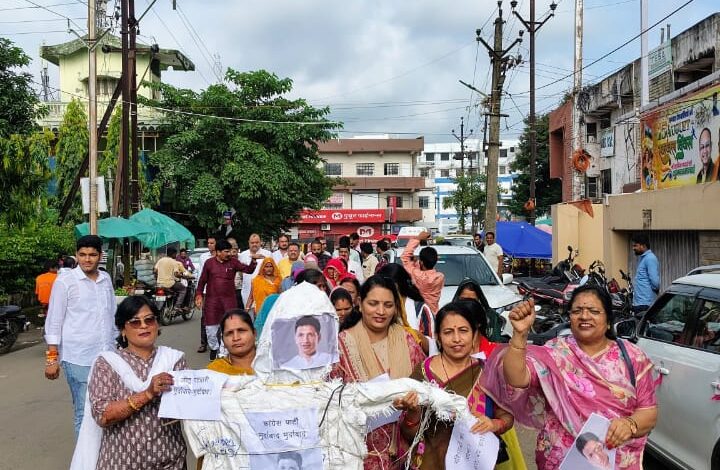 मध्य प्रदेश भारतीय जनता पार्टी प्रत्येक जिला केंद्र पर प्रदेश कांग्रेस के अध्यक्ष जीतू पटवारी द्वारा महिलाओं के खिलाफ की गई अभद्र भाषा का प्रयोग एवं उनको शराबी बताने की घोर निंदा के साथ महिला मोर्चा द्वारा पुतला दहन का कार्यक्रम किया गया जिला अध्यक्ष अनीता अग्रवाल ने बताया कि आज परशुराम चौक पर महिला मोर्चा एवं भारतीय जनता पार्टी के कार्यकर्ता जिला अध्यक्ष समेत सभी ने जीतू पटवारी कि बयान की घोर निंदा करते हुए पुतला दहन किया।