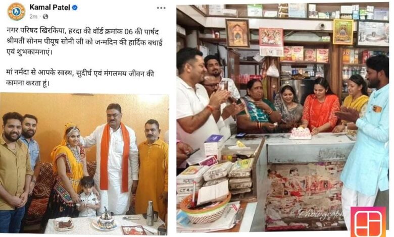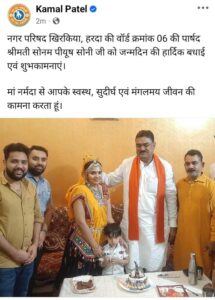 पूर्व कृषि मंत्री कमल पटेल ने नगर परिषद खिरकिया में भाजपा पार्षद श्रीमती सोनम पीयूष सोनी को दी जन्मदिन की शुभकामनाएं