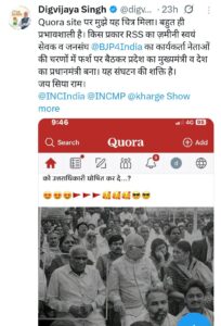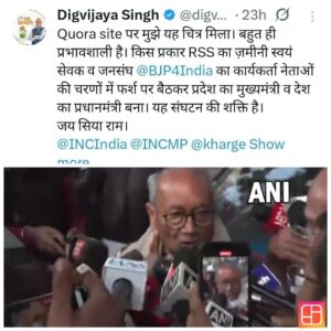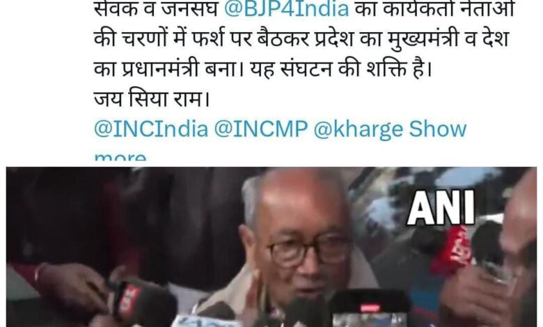 दिग्विजय सिंह ने पोस्ट में तस्वीर को प्रभावशाली बताते हुए लिखा कि राष्ट्रीय स्वयंसेवक संघ (आरएसएस) का एक ज़मीनी स्वयंसेवक और जनसंघ-बीजेपी का कार्यकर्ता नेताओं के चरणों में बैठकर प्रदेश का मुख्यमंत्री और देश का प्रधानमंत्री बना। उन्होंने इसे संगठन की शक्ति का उदाहरण बताया।
