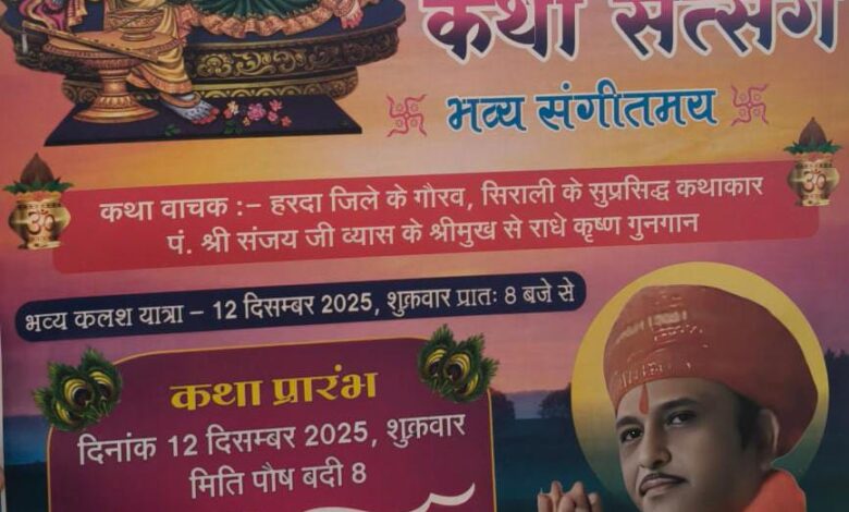 कार्यक्रम की शुरुआत 12 दिसंबर 2025, शुक्रवार को प्रातः 8 बजे आकर्षक कलश यात्रा के साथ होगी। प्रतिदिन कथा दोपहर 1 से 4 बजे तक आयोजित की जाएगी, जिसमें भक्तिभाव से जुड़ी प्रस्तुतियाँ होंगी।