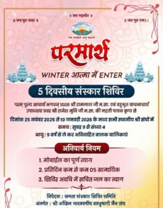 आधुनिक भौतिकता और दिखावटी उत्सवों से हटकर नववर्ष को संस्कार, साधना और आत्मिक उन्नयन से जोड़ने की अनूठी पहल की जा रही है। 31 दिसंबर को सामान्य मनोरंजन में समय व्यतीत करने की बजाय, 31 दिसंबर से 4 जनवरी तक चारूवा में शासन दीपिका प्रज्ञा श्री जी म.सा. (ठाणा-4) के पावन सानिध्य में 9 से 30 वर्ष तक के अविवाहित बच्चों एवं युवाओं के लिए “परमार्थ विंटर से आत्मा में इंटर शिविर” का आयोजन किया जा रहा है।