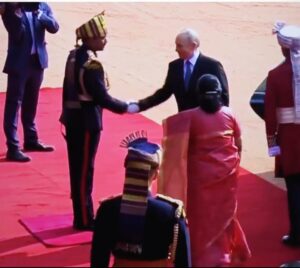 जैसे ही राष्ट्रपति पुतिन की कार राष्ट्रपति भवन के प्रांगण में रुकी, वे मुस्कुराते हुए बाहर निकले। उन्होंने आगे मौजूद राष्ट्रपति और प्रधानमंत्री की ओर अभिवादन किया, लेकिन फिर अचानक उन्होंने बाईं ओर मुड़कर मेजर जनरल परिड़ा से हाथ मिलाया। इसके बाद उन्होंने राष्ट्रपति द्रौपदी मुर्मू और प्रधानमंत्री नरेंद्र मोदी से औपचारिक रूप से हैंडशेक किया।