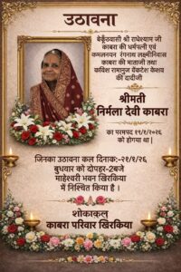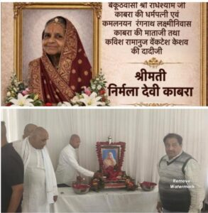 उल्लेखनीय है कि श्रीमती निर्मला देवी काबरा का निधन 19 जनवरी 2026 को हो गया था। वे बैकुंठवासी श्री राधेश्याम जी काबरा की धर्मपत्नी कमलनयन रंगनाथ लक्ष्मीनिवास काबरा की माताजी एवं कविराज रामानुज वेंकटेश केशव की दादीजी थीं।
