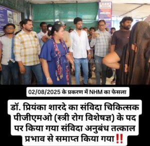 राष्ट्रीय स्वास्थ्य मिशन, मध्य प्रदेश ने जिला चिकित्सालय हरदा में पदस्थ संविदा स्त्री रोग विशेषज्ञ डॉ. प्रियंका शारदे का अनुबंध तत्काल प्रभाव से समाप्त कर दिया है।