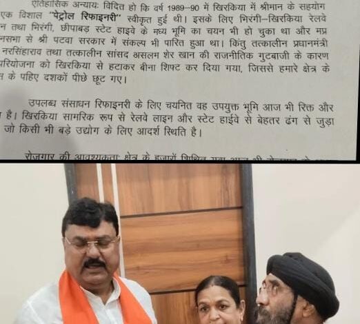 ज्ञापन में बताया गया कि वर्ष 1989-90 में खिरकिया में पेट्रोल रिफाइनरी स्थापित करने की स्वीकृति मिली थी और इसके लिए उपयुक्त भूमि का चयन भी किया गया था। रेलवे लाइन और स्टेट हाईवे के बीच स्थित यह भूमि औद्योगिक दृष्टि से बेहद उपयुक्त मानी गई थी। लेकिन तत्कालीन राजनीतिक परिस्थितियों के चलते यह परियोजना खिरकिया से हटाकर अन्य स्थान पर स्थानांतरित कर दी गई, जिससे क्षेत्र विकास की दौड़ में पीछे रह गया।