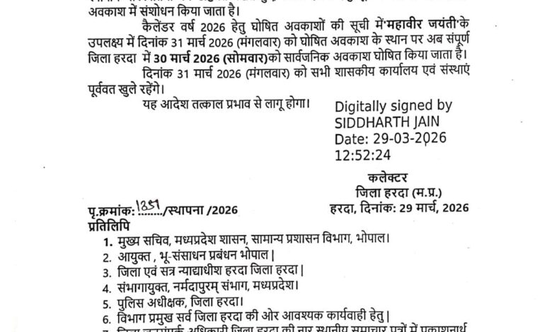 *हरदा कलेक्टर का बड़ा फैसला: महावीर जयंती की छुट्टी एक दिन पहले*…. *महावीर जयंती पर प्रशासन का निर्णय: तारीख बदली, अब 30 मार्च को छुट्टी*…… *हरदा में छुट्टी का शेड्यूल बदला: महावीर जयंती पर 30 मार्च को रहेगा अवकाश*