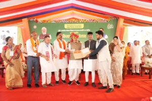 मुख्यमंत्री ने मंच से पुष्प वर्षा कर किसानों का अभिनंदन किया और उत्कृष्ट कार्य करने वाले किसानों को सम्मानित भी किया। “एक जिला एक उत्पाद” योजना के तहत बांस के प्लांटर भेंट किए गए।